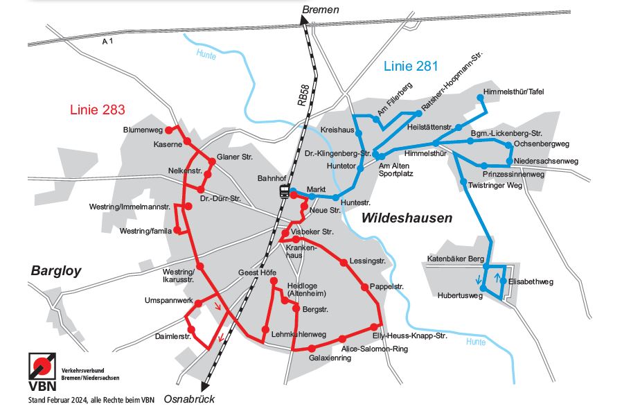 Unser Bus fährt Sie stündlich ab Bahnhof Wildeshausen entweder in Richtung Katenbäker Berg (Linie 281) oder zu den Einkaufszentren Richtung Westring (Linie 283) und zurück.